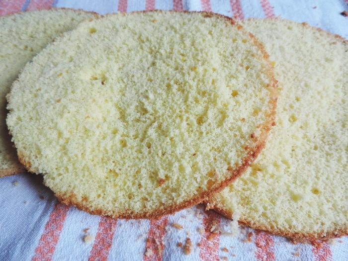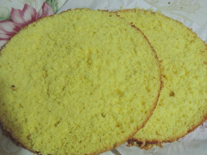Если хотите получить более высокий бисквит, то выпекаем в форме 18см. Его можно будет разрезать на 4 пласта. Форма 20 см даст возможность разрезать бисквит на 3 пласта. Соответственно, в форме 22см вы выпечете бисквит, который сможете разрезать на 2 пласта. Брать форму больше не рекомендую, или увеличивайте количество ингредиентов.