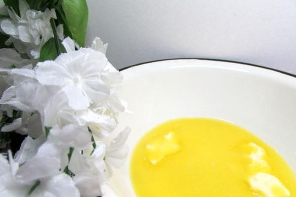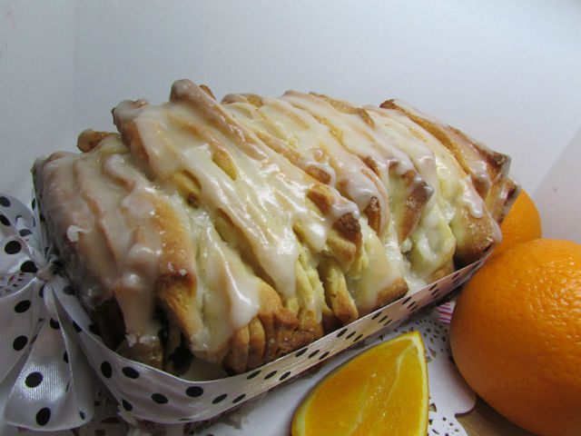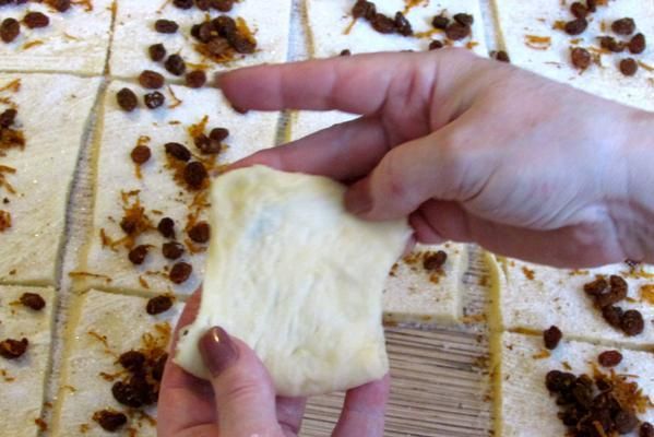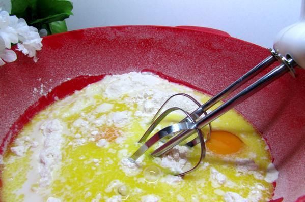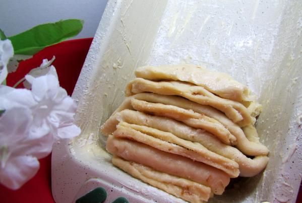 Форму для кекса смазать маслом, присыпать мукой, поместить форму в любую чашу так, чтобы форма стояла вертикально под наклоном. Подготовленные таким образом “слои” теста выкладывать в форму свободно, не прижимая слои друг к дружке, чередуя сгиб – один слой сгибом вверх, другой сгибом вниз.