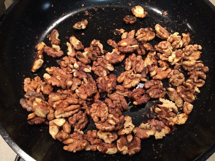 Грецкие орехи пожарьте на сухой сковороде в течение 8-10 минут. Дайте остыть, затем порубите на крупные кусочки.