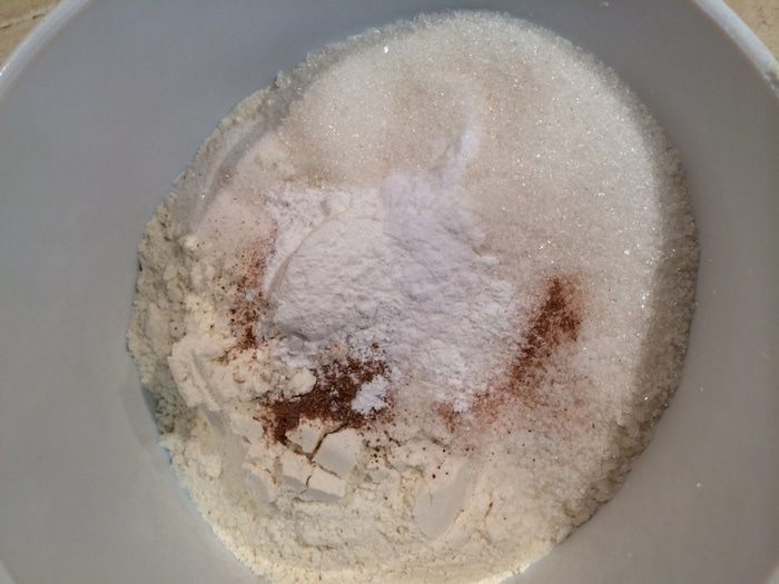 В большой миске смешайте все сухие ингредиенты: муку, сахар, ванильный сахар, разрыхлитель, соду, соль, корицу.