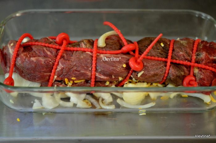 Свернуть аккуратно рулетом, используем кулинарную нить или зубочистки. Положить в жаропрочное блюдо, выложить лук вокруг, что остался, вылить маринад что остался. Поставить в разогретую духовку на 230 гр. на 40-45 мин.