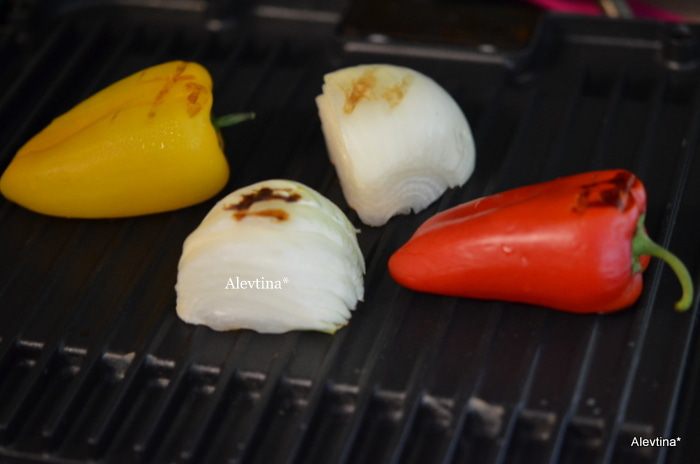 Приготовить на гриле лук и сладкий перец, очистить, порезать.