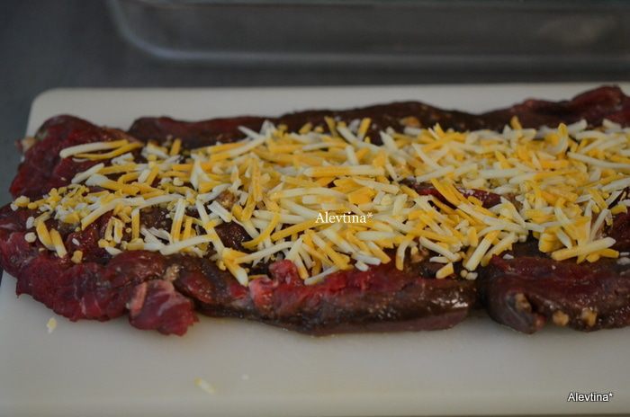 Достать говядину из маринада, посолить и поперчить, выложить слой сыра.