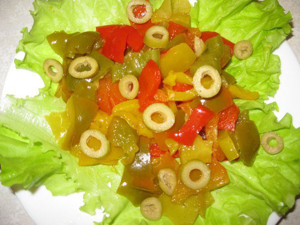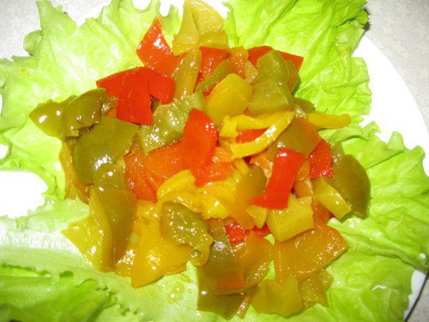 Перец можно еще мельче порезать, перемешать с заправкой и выложить на листья салата.