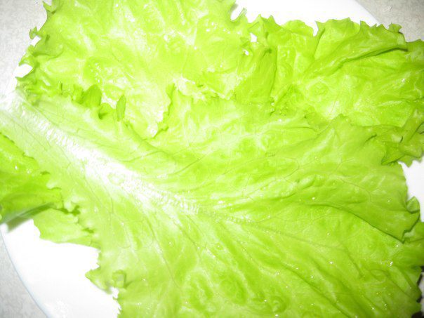 На дно тарелки выложить листья салата, по 3- 4 листа на каждую. Сбрызнуть заправкой.