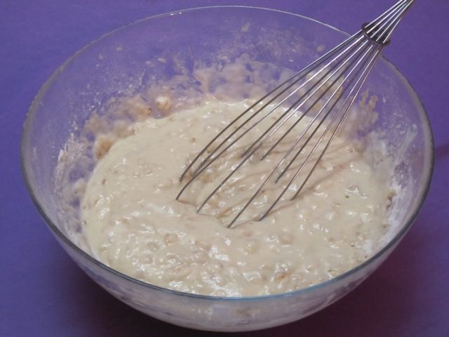 Эту мучную смесь всыпать в кефирную, взбить массу как на кекс. Тесто должно стекать струйкой с венчика. Если консистенция другая, то можно добавить или кефир, или муку.