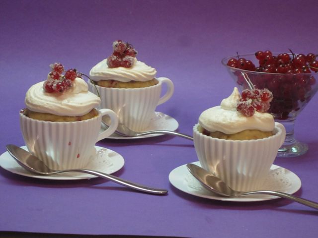 Маффины вынуть из духовки, отсадить белковый крем. Выпекать еще 10 минут. Для украшения 50 грамм смородины с веточками вымыть, окунуть в 40 грамм сахара, выложить на безе.
