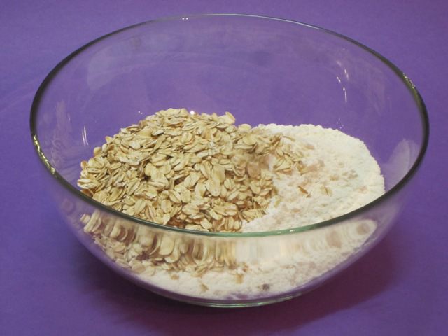 В другой миске просеять 175 грамм муки. Всыпать разрыхлитель и хлопья "Геркулес" без варки, можно взять мюсли.
