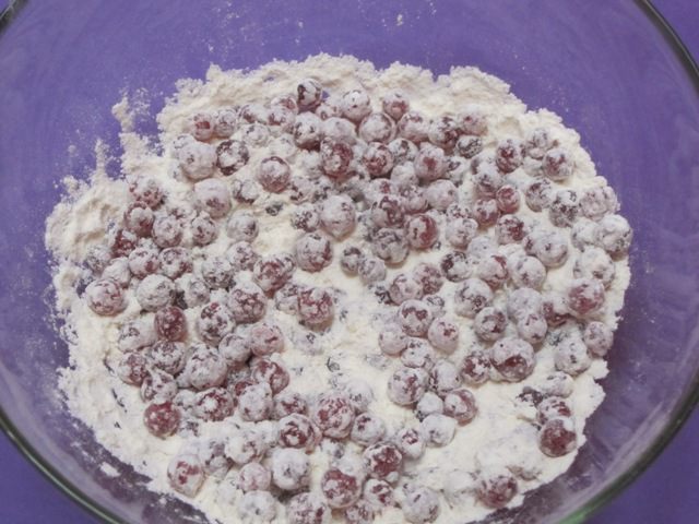 150 грамм смородины вымыть, снять с веточек, обвалять в 25 г муки. Оставшиеся 50 грамм смородины оставить на веточках для украшения.
