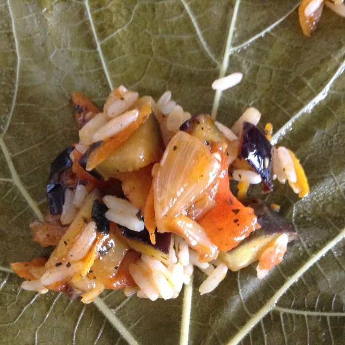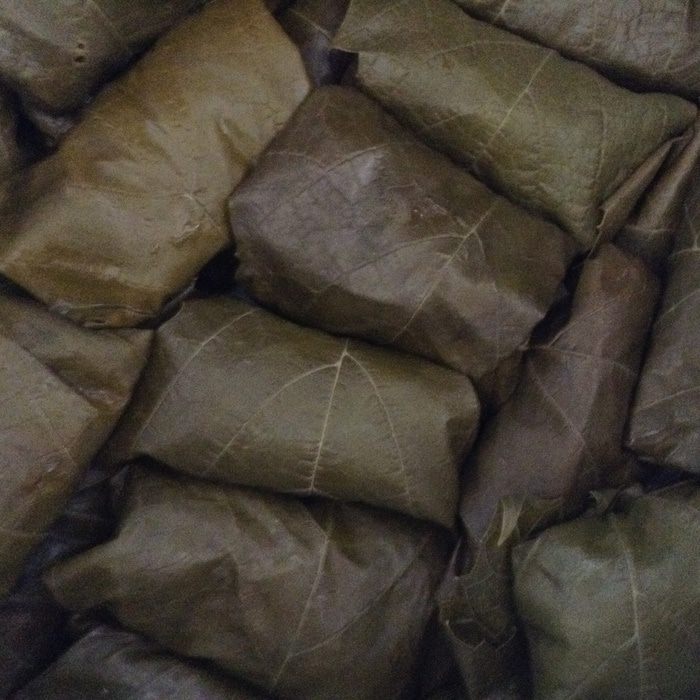 Взять лист винограда, положить гладкой стороной вниз. На лист положить 1ст. л. начинки.