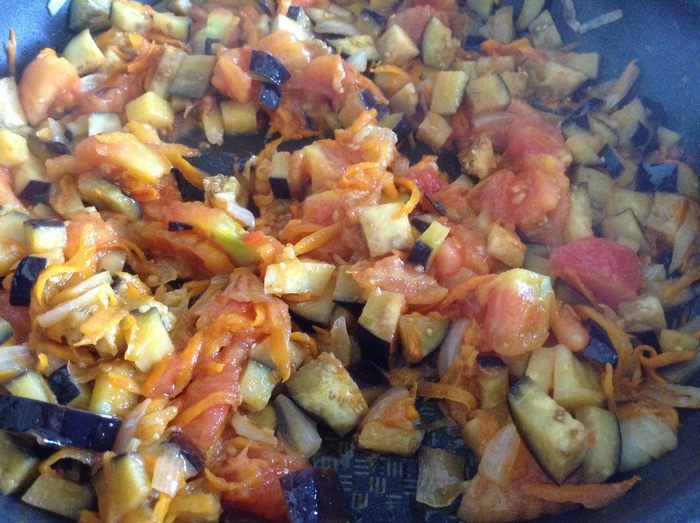 К луку добавить нарезанные помидоры и баклажаны. Обжарить пару минут.