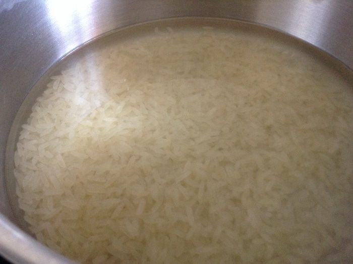 Рис хорошо промыть. Поставить на огонь, дать закипеть, огонь убавить, накрыть крышкой и варить 10 минут.