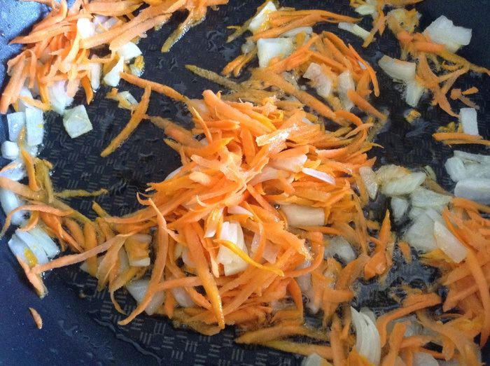 Обжарить лук и морковь.