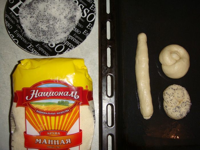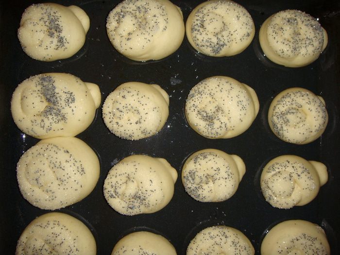 Тесто обмять. Отщипнуть часть теста, скатать колбаску, завязать тесто в узелок и обмакнуть в сахар с маком. Выложить заготовки булочек на смазанный маслом противень.