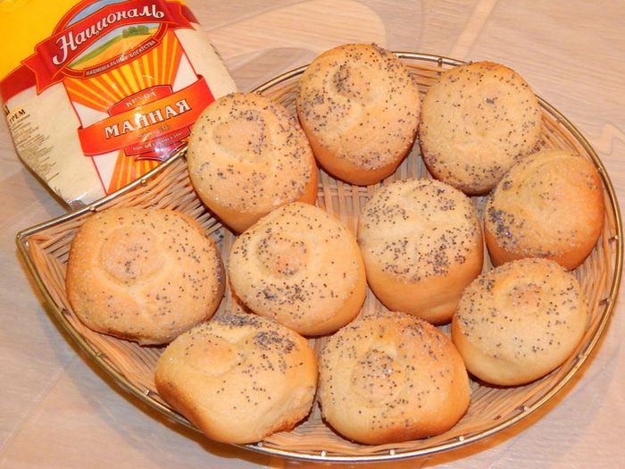 Дать булочкам подойти в тепле, в течении 10 минут. Поставить противень в разогретую до 180°С духовку на 20-25 минут. В низ духовки поставить железную чашку с водой, чтобы булочки были мягкими.
