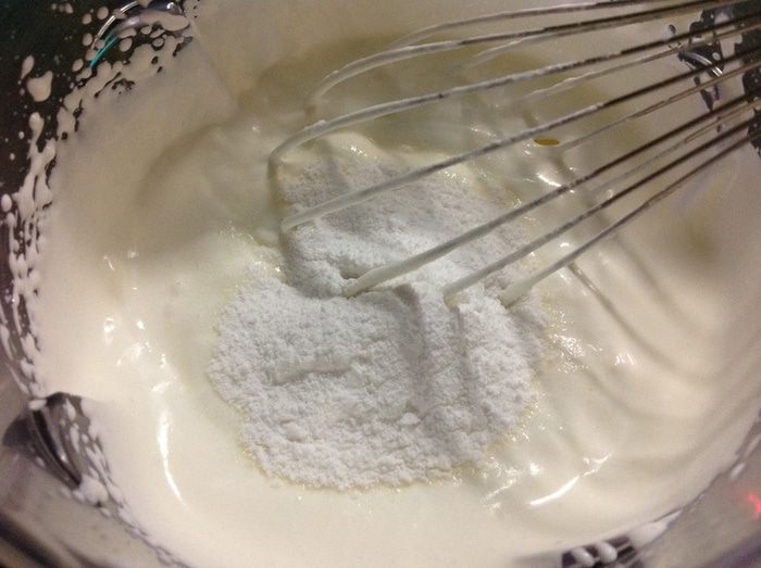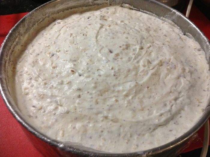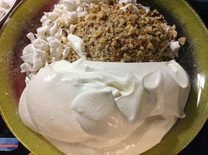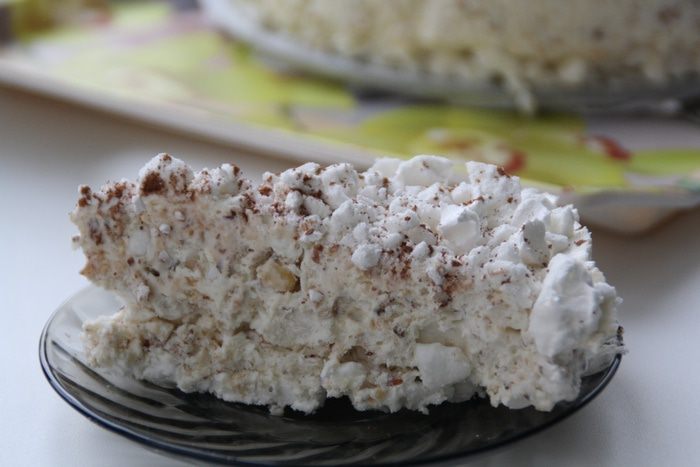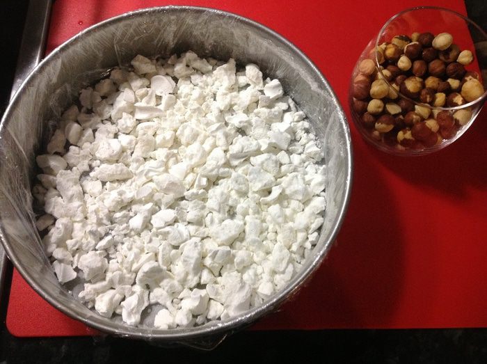 Выкладываем сливочно-белковую массу в форму и разравниваем.Верх покрываем оставшимися крошками безе. Отправляем замораживаться на 8-10 часов. Десерт перед подачей следует выдержать минут 10 при комнатной температуре, но он не застывает совсем, напоминает мороженое, а потом, немного постояв, превращается в нежнейшее "облачко";-)По желанию посыпаем верх десерта какао...