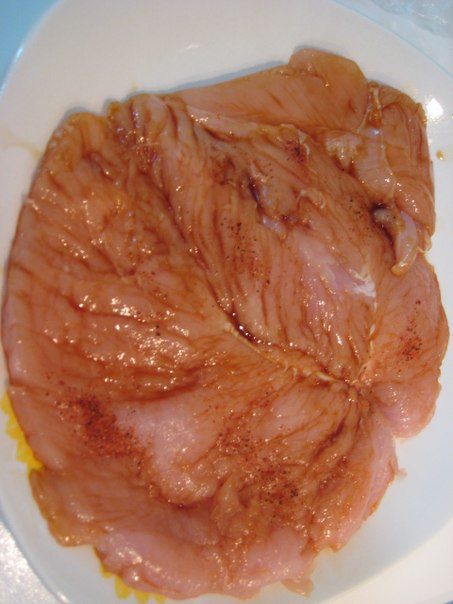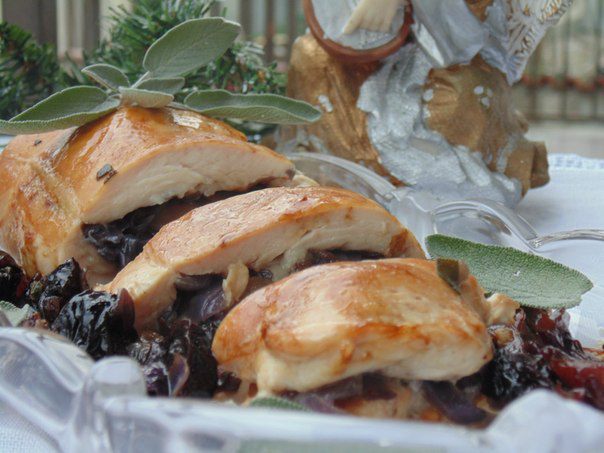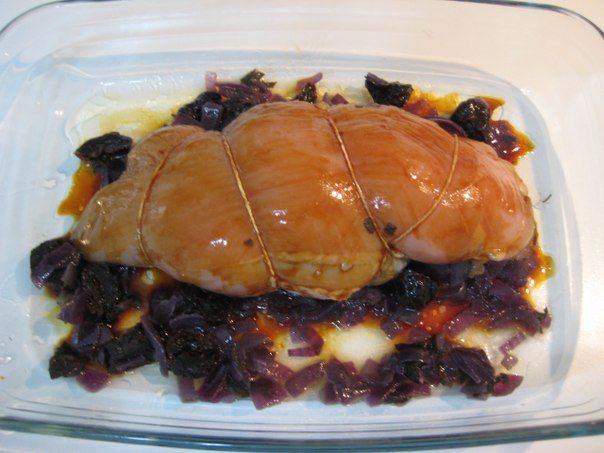 Начинку выложить на куриное филе, скрутить рулетом, перевезать кулинарной нитью. Форму смазать оливковым маслом, положить в форму куриное филе, вокруг выложить оставшуюся начинку, налить 2 ст. л. воды.Сверху смазать филе соусом Терияки. Накрыть фольгой. Запекать при температуре 180 гр 35 минут. Затем снять фольгу и подрумянить в течении 10 минут. Снять нитки. Подавать горячим.