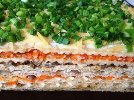 Повторить все 3 коржа. 7й смазать майонезом, засыпать тертым сыром и сверху нарезанным луком.