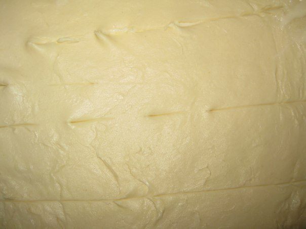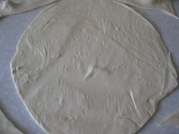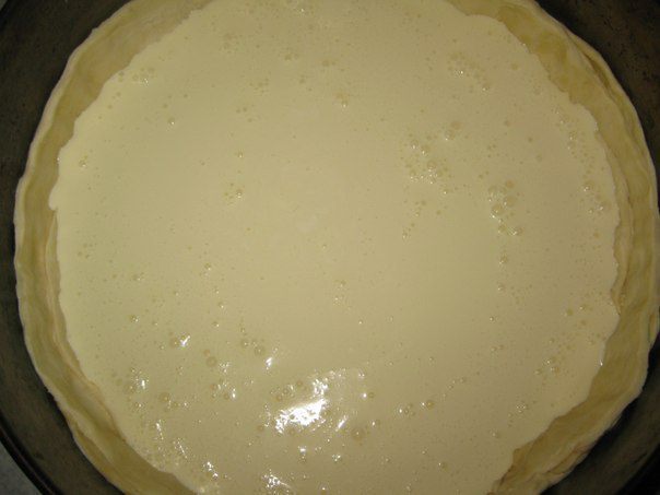 Тесто раскатать толщиной 0,5 см, вырезать 2 пласта по размеру формы и полоски для выкладывания боков формы.