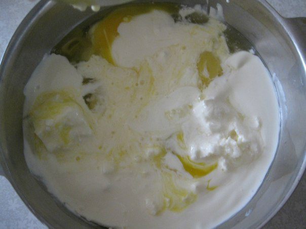 Для начинки мягкий сыр, у меня Фету, взбить 3 яйцами и сметаной.