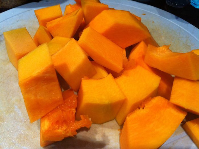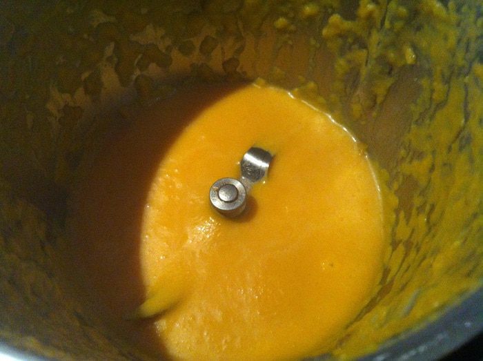 В сотейнике растопите сливочное масло, добавьте тыкву, накройте крышкой и варите на медленном огне примерно 20 минут, пока тыква не станет очень нежной, время от времени помешивайте ложкой, в конце варки снимите крышку и дайте жидкости немного испарится. Измельчите в блендере и остудите.