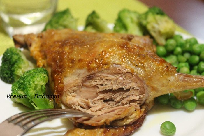 Обмазать полученной смесью утиный окорочок. Завернуть в фольгу и поставить в заранее разогретую до 180 градусов духовку, на 50 минут. Затем открыть фольгу и запекать еще 20 минут до золотистой корочки.