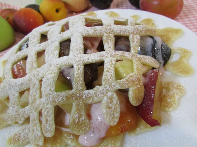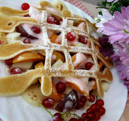 Прикрыть фрукты с йогуртом вторым блинчиком. Посыпать сахарной пудрой.