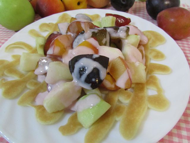 На тарелку положить блинчик. На него выложить фрукты с соком (если он образовался) и полить 2 ст. л. йогурта.