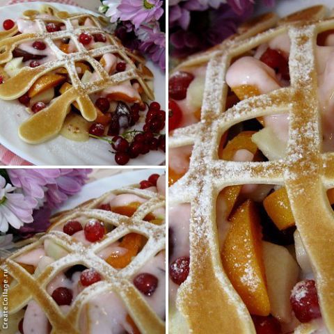 Украсить блинчики: молотыми орехами, сахарной пудрой, натертым шоколадом, замороженными или свежими ягодами, половинками винограда, корицей. У меня красная смородина.
