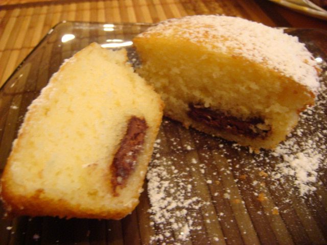 Я 4 кексика сделала с шоколадом, для этого в смазанные формочки положила по 1 ст.л. теста и положила 1 кусочек шоколада и сверху тесто 2 ст.л.