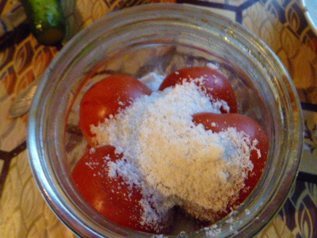 Сверху на помидоры насыпаем соль. По желанию можно добавить любые специи...