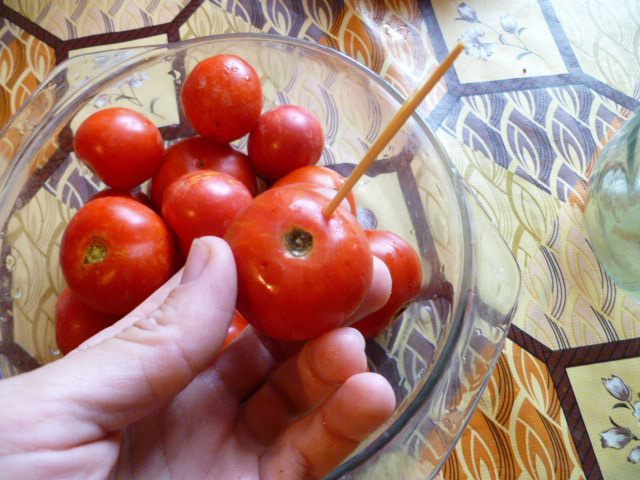 С помощью зубочистки сделать проколы у основания помидора.