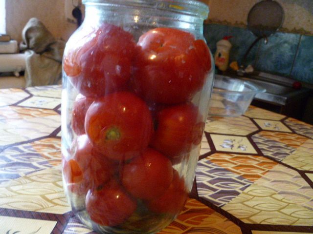 Уложить подготовленные помидоры в стерилизованную банку.