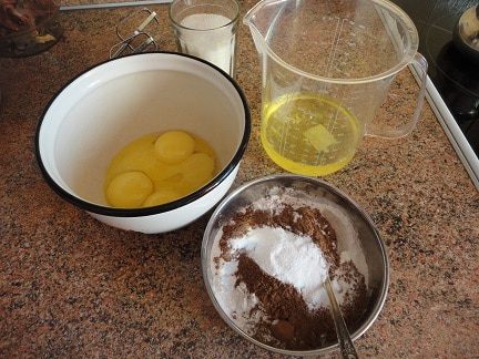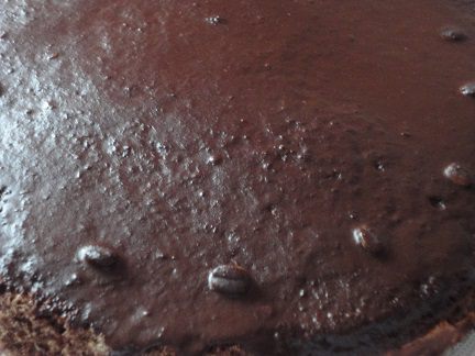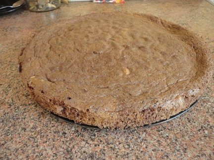 6. Пласты основы слегка пропитать сладким черным кофе ( у меня было 50 г черного кофе, смешанного с 50 г кофейного ликера), положить один на другой в разъемную форму, соединив их полу застывшим кремом. Поставить в холодильник.