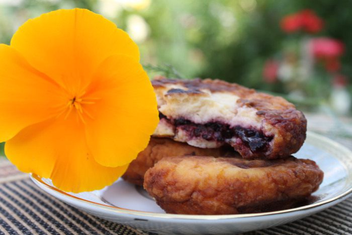Теперь берем где-то 2 ст л. теста, расплющиваем его в ладони. На середину кладем 0,5 ст.л. варенья, защипываем края, пряча начинку и формируем сплющенный колобок.