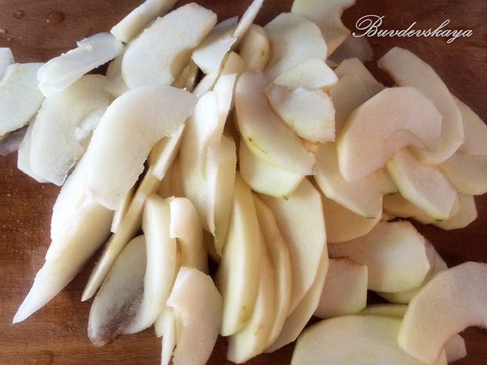 Яблоки и груши вымыть, обсушить, очистить от кожуры, удалить сердцевинки, мякоть нарезать тонкими ломтиками.
