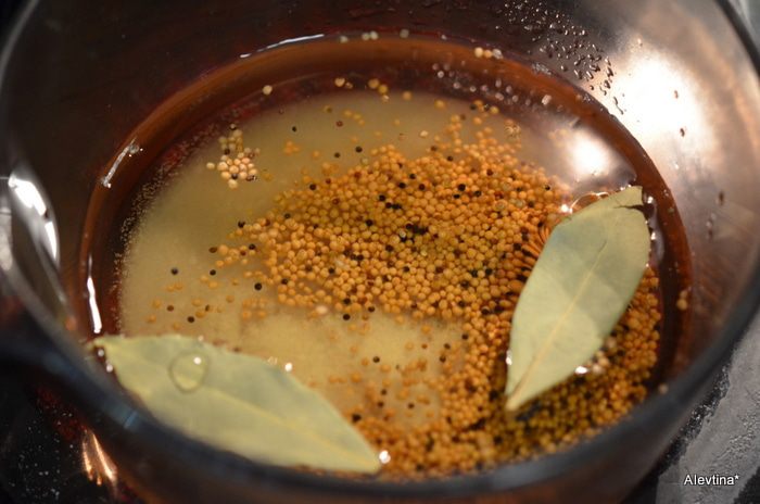 Смешаем уксус, сахар, семена желтой горчицы (специя), соль , лавровый лист. Поставим на средний-медленный огонь, помешиваем, примерно 5 мин., чтоб сахар разошелся, растворился. Снять с огня и дать остыть.