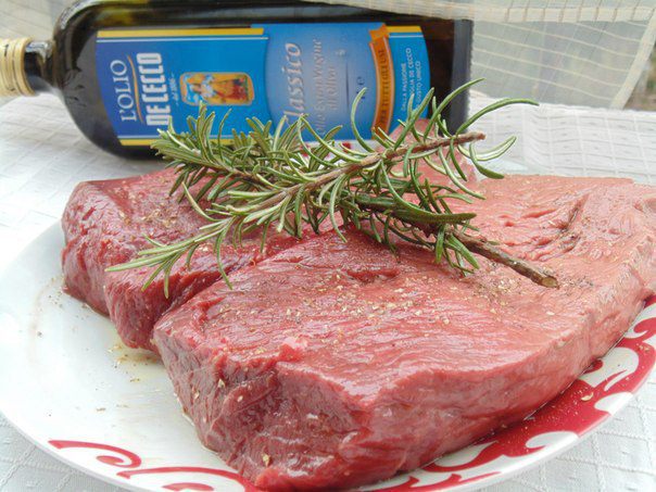 Мясо достать из холодильника за два часа до приготовления. Слегка смазать оливковым маслом, поперчить черным перцем крупного помола.