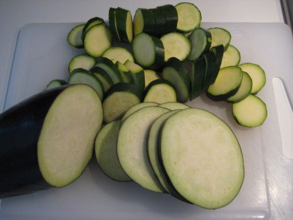 Порезать баклажаны и цукини кружочками, шампиньоны разрезать пополам.
