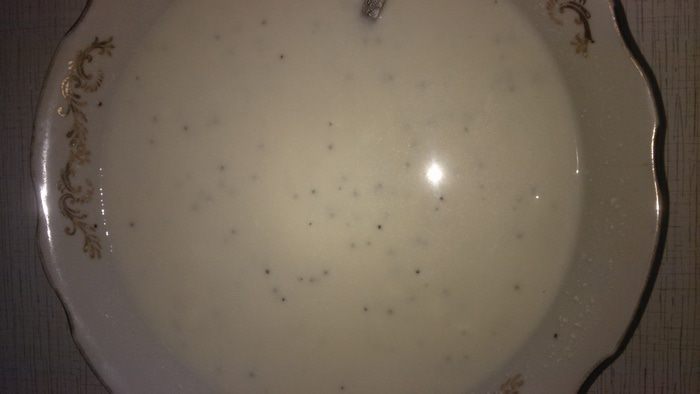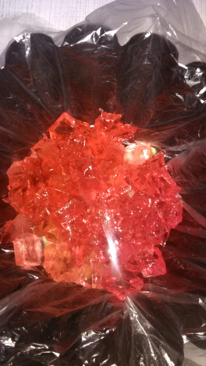 Тем временем желе застыло, его нужно извлечь из формы, немного подержав форму в горячей воде. Нарезаем желе на кубики (можно добавить немного разных фруктов, у меня был один киви). Подходящую форму застелить пленкой, выложить нарезанные кубики желе и фруктов и залить сверху творожно-желатиновой массой. Перемешайте, чтобы кубики распределились по всей форме.