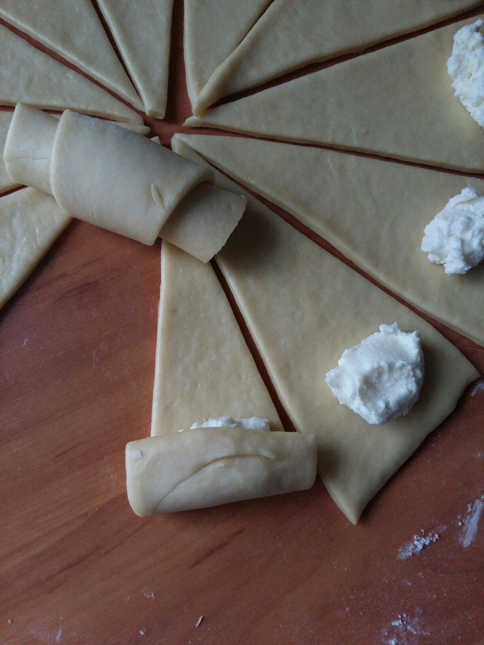 От готового теста отрезаем комочек. Раскатываем на столе. Подсыпать мукой уже не нужно. Режем на 12 частей. Можно на 8 частей. Тогда рогалики будут больше размером. Удобнее всего резать ножом для пиццы. Раскладываем начинку.