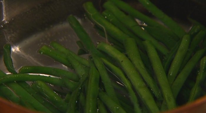 Фасоль отваривать в кипящей воде несколько минут, затем воду слить и поместить фасоль в посуду со льдом или обдать ледяной водой.