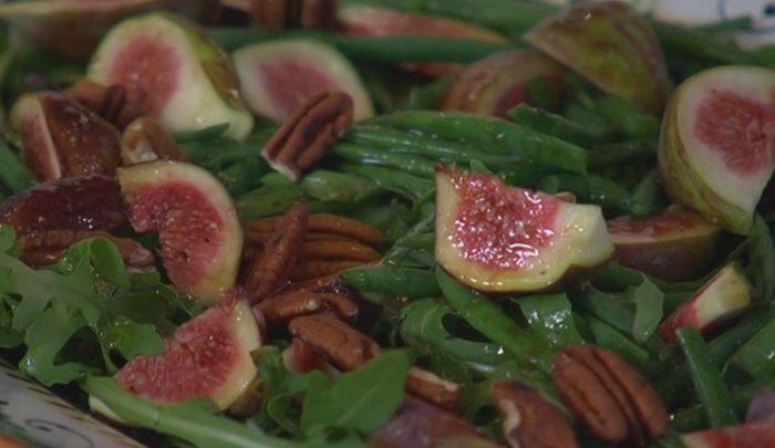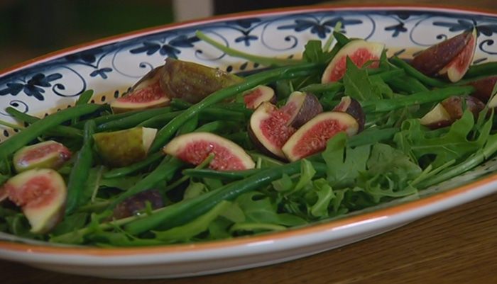 На большую тарелку выложить руколу, сверху разложить фасоль, инжир, полить все заправкой.