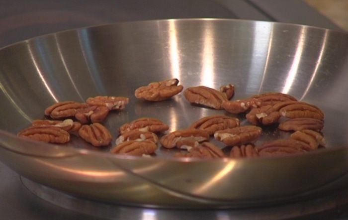 Орехи пекан слегка подсушить на разогретой сковороде (ни в коем случае не жарить!).