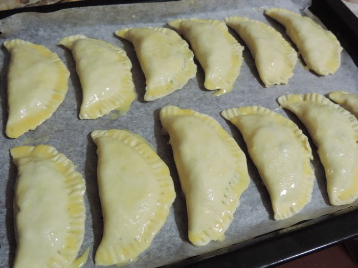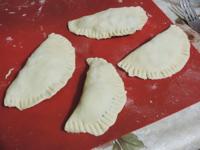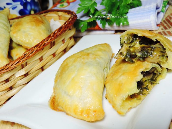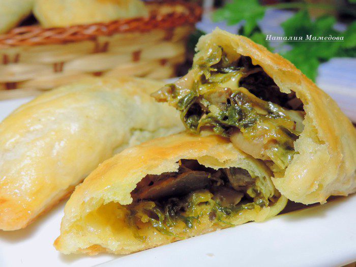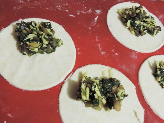 Для начинки шампиньоны мелко нарезаем, выкладываем на раскаленную сухую сковороду, держим их там до испарения жидкости, затем уменьшаем огонь, добавляем растительное масло и мелконарезанный лук (одну среднюю или половину крупной луковицы). Жарим до готовности лука.
