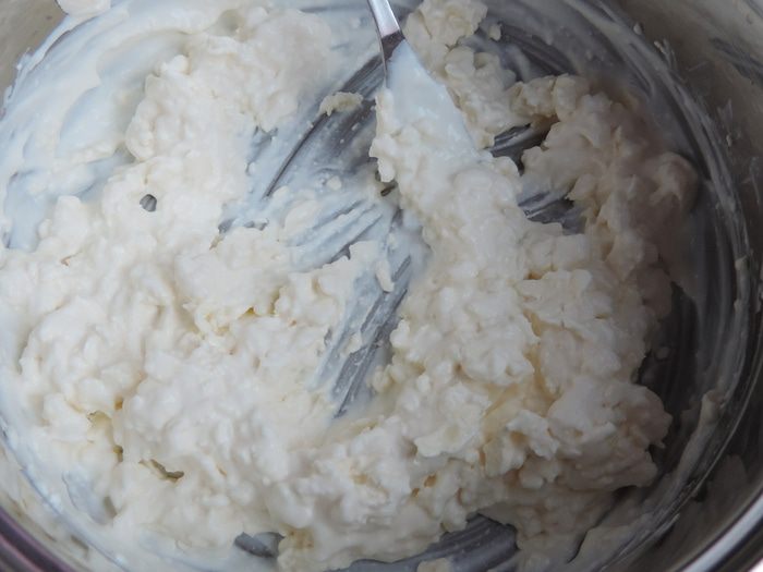 Охлажденную начинку смешиваем с сыром, натертым на крупной терке.