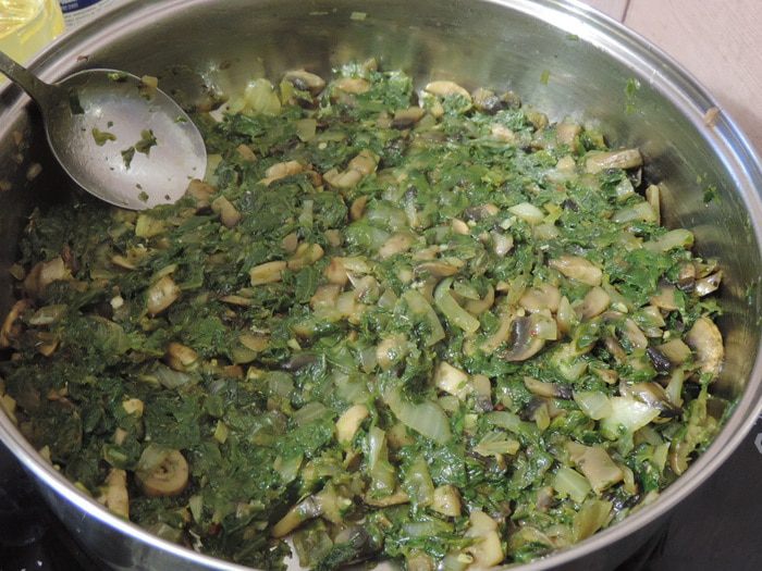 Затем добавляем на сковороду шпинат и обжариваем все вместе. Я шпинат разморозила заранее, хотя этого можно и не делать.
