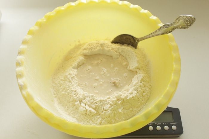 Насыпать муку в большую миску,сделать в ней углубление. Насыпать дрожжи,добавить к ним сахар и 70 мл теплой воды.