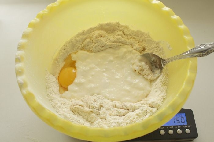 Добавить яйцо ,йогурт, 130 мл теплой воды, олив.масло ,семечки.