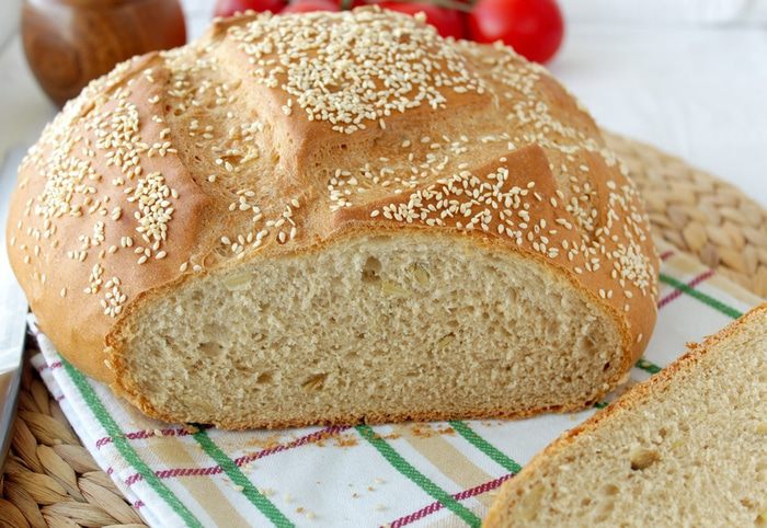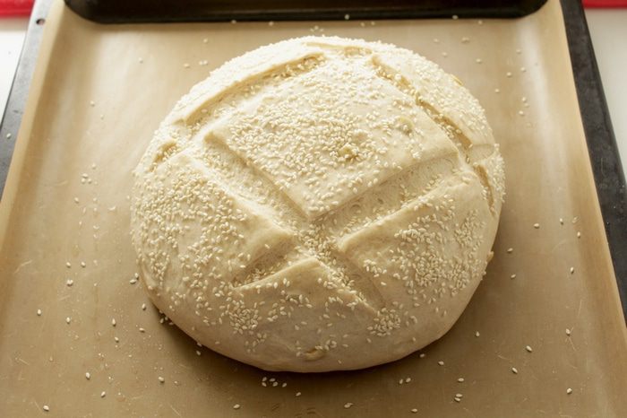 Смазать хлеб водой, присыпать обильно кунжутом, сделать пару надрезов.